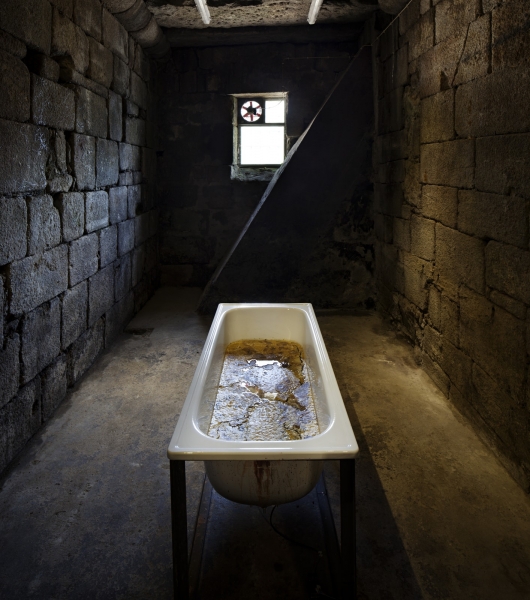 Jouant avec l’échelle des corps: de l’image au format intime d’un buste en ruine que jouxte un miroir aveugle, de l’ergonomie d’une baignoire pleine de cire d’abeille, aux grandes toiles où le bitume reprend peu à peu le dessus sur la peinture à l’huile, la réunion de ces travaux place le spectateur face à la fragilité du regard et du souvenir des formes.